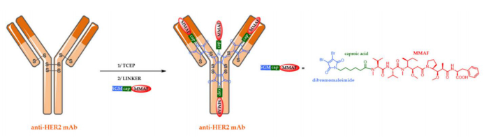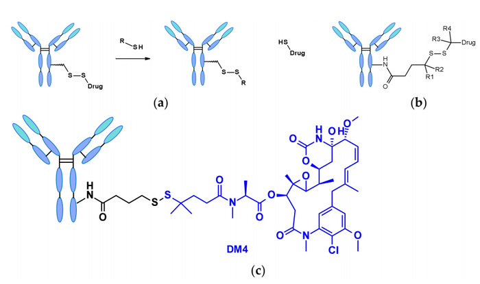 从有效载荷DM1和DM4中,通过使用二硫键与连接子偶联。稳定的二硫键连接子在血液循环中表现出良好的稳定性,同时在细胞内保持有效的分裂。