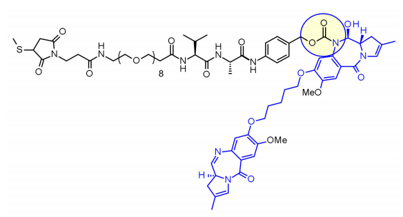 Val-Ala二肽也被广泛应用,有7个分子处于临床阶段,进展最快的是Loncastuximab tesirine,其包括一个聚乙二醇化间隔子,以平衡属于PBD二聚体家族的有效载荷SG3199的亲脂性。