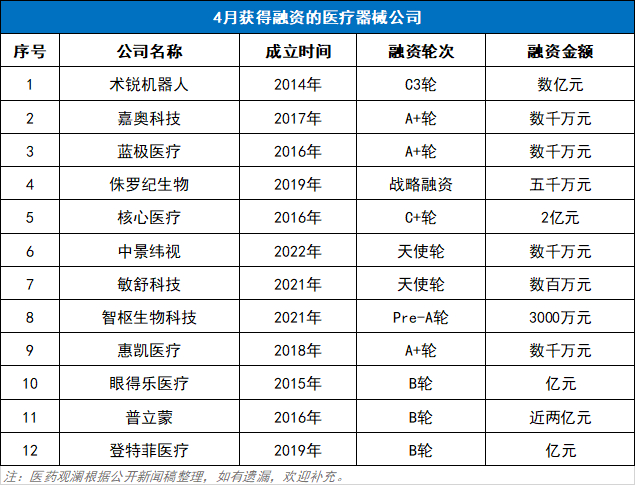 除了上述公司,还有其它创新医疗器械公司也在今年4月完成融资,限于篇幅,本文不再一一介绍。希望在资本的助力下,这些公司可以加快创新产品的研发进度,早日为广大患者带来新的治疗选择。