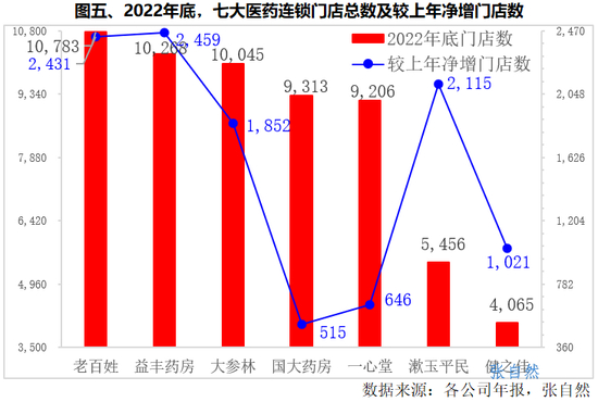 净增>2,000家的有3家,即益丰药房(+2,459家)、老百姓(+2,431家)、漱玉平民(+2,115家)。