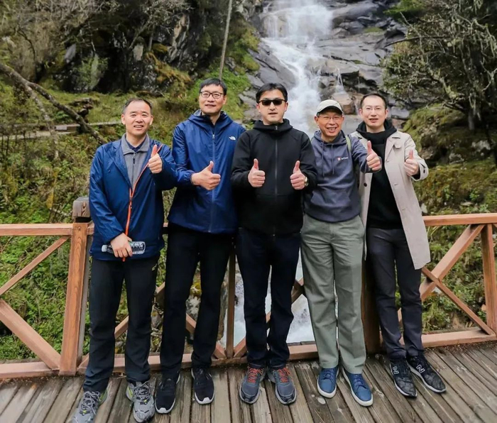 王志伟博士(左二)与百济神州高级副总裁、全球研发负责人汪来博士(中)及其他百济神州临床前研究负责人在团建活动上的合影。
