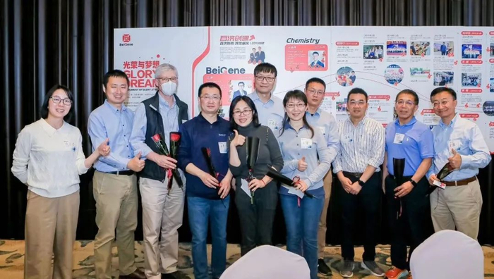 百济神州化学部门的部分团队成员在2023年4月研发会议上合影。王志伟(中)和药物化学执行总监郭运行(右四)是泽布替尼的发明人。