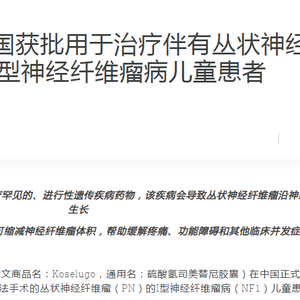 此次司美替尼获得NMPA的批准是基于SPRINT研究中Stratum 1人群的积极结果,该研究结果已发表于《新英格兰医学杂志》。临床试验结果表明,司美替尼作为一种口服激酶抑制剂,可缩小不可手术儿童患者的瘤体体积。具体来看,罹患伴有PN的NF1儿童患者经每日两次口服司美替尼治疗后的客观缓解率(ORR)达到66%(50名患者中有33名部分缓解),ORR是指完全缓解(PN消失)或出现部分缓解(瘤体体积缩小至少20%)的患者百分比。