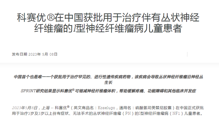 5月8日,阿斯利康对外宣布,其与默沙东共同开发的有丝分裂原活化蛋白激酶(MEK)抑制剂硫酸氢司美替尼胶囊,在中国正式获批用于治疗3岁及3岁以上伴有症状、无法手术的丛状神经纤维瘤(PN)的I型神经纤维瘤病(NF1)儿童患者。值得注意的是,据阿斯利康透露,司美替尼是中国首个也是目前唯一一个获批用于治疗罕见的、进行性遗传疾病药物,该疾病会导致PN沿神经丛生长。