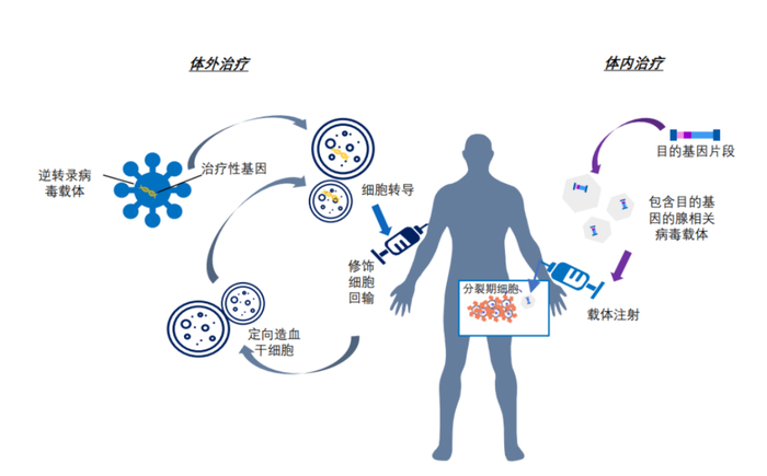 根据作用类型的不同,我们主要可将 CGT 分为两大类——体内治疗和体外治疗: