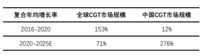 全球CGT行业市场规模自2016年开始飞速增长,中国CGT行业市场规模在政策利好及研发投入增长的背景下也将快速扩增