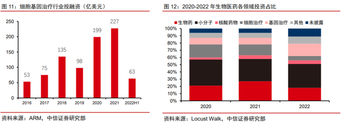 2017 年,Gliead 以119亿美元的价格收购 Kite Pharma;2018 年,BMS(Celgene)斥资 55 亿美金收购 Juno。行业内合作交易同样活跃,Big pharma 也通过战略合作等方式进入 CGT 领域。礼来、罗氏、诺华等均通过收购/交易等方式进入 CGT 领域。2022 年,基因治疗领域在行业总体投融资中的占比从 7%上升至 17%。