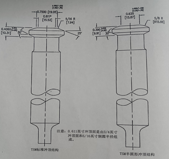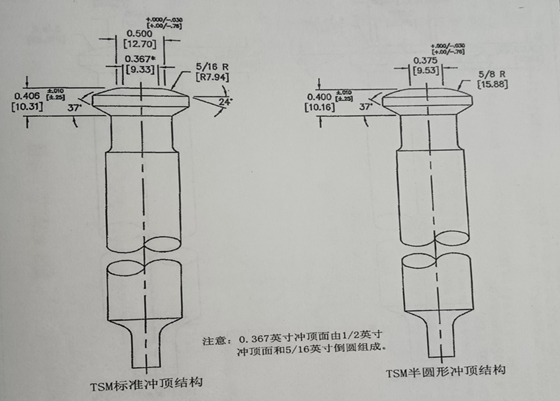 g选择D型冲模具,在压片速度不变的情况下,可以增加保压时间。最常用于压片机的冲模哟B型和D型冲模,具体尺寸见下图,根据下图可知,B型冲冲顶直径为9.33mm(标准冲顶结构)或9.53mm(半圆形冲顶结构);D型冲冲顶直径为15.53mm(标准冲顶结构)或15.87mm(半圆形冲顶结构);D型冲的冲顶直径远远大于B型冲冲顶直径,所以压片时D型冲保压时间大于B型冲,不易出现断片/裂片问题。