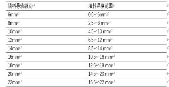 e填料导轨不合适,那么填料导轨如何选择?一般填料导轨有2mm的层级,并且每级分别覆盖5.5mm的填料深度范围,例如8mm填料导轨覆盖了从2.5∽8mm的填料深度范围,具体填料导轨对应的填料范围如下表: