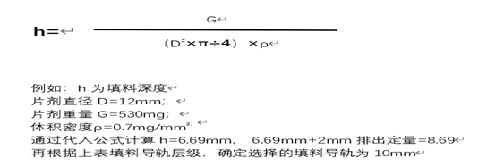 使用不同的填料导轨与压制物料及压制物料的压缩度相关,应选择能够保证排出至少1∽2mm压制物料的填料导轨,以避免对片剂重量造成不良影响。确定填料导轨,计算填料深度的公式如下: