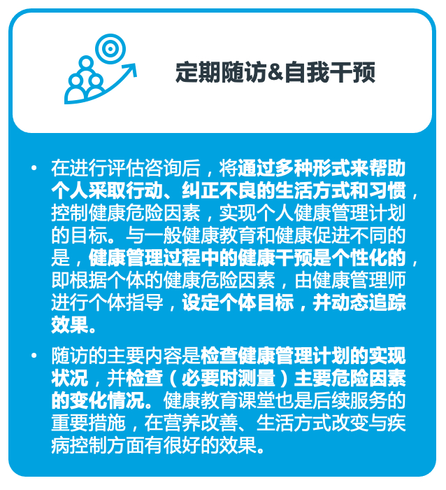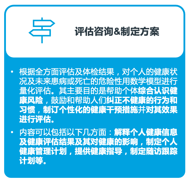 健康管理是对个人或人群的健康危险因素进行全面管理的过程。可以了解您的身体年龄,判断患病倾向,由医生向您提供健康生活处方及行动计划。长期(终生)跟踪您的健康,最大限度减少疾病的发生。同时,及时指导就医,降低个人医疗花费,提高您的保健效率,最终达到提高个人生命质量的目的。