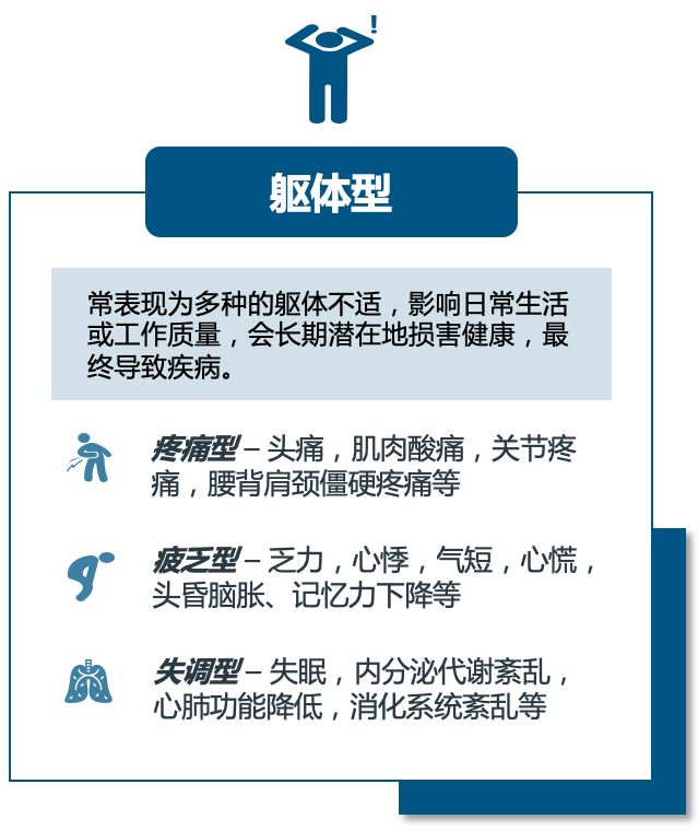 现阶段社会极大地拓宽了健康的观念,从过去的仅关注躯体的健康,到现在包括心理、社会适应、道德品质,相互依存、有机结合。目前,亚健康主要有三种表现形式:躯体型、心理型和社会交往型。