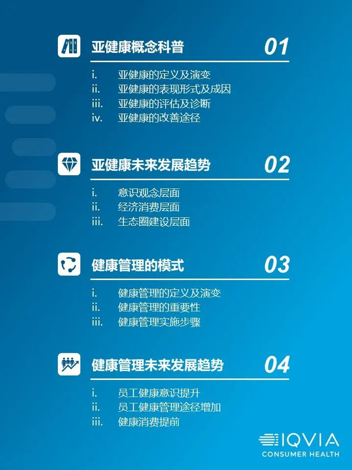 IQVIA《企业白领健康管理趋势白皮书》将于近期发布,将着眼于企业员工的亚健康状态调整,挖掘未来健康管理趋势及机会。同时,我们期待与相关伙伴探讨定制化的合作,共建健康管理生态圈。