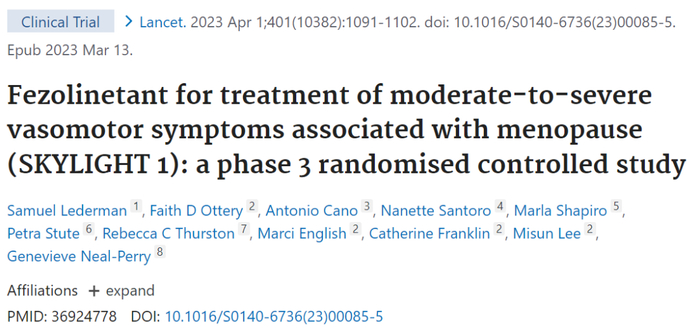 Veozah的有效性在两个随机双盲、安慰剂为对照的3期临床试验中获得证明。其中在SKYLIGHT 1临床3期试验的分析结果显示,与安慰剂组相比,接受30毫克Veozah和45毫克Veozah的患者,在第4周显著减少了血管运动症状的频率与严重程度。详细数据发布于今年4月的《柳叶刀》期刊当中。