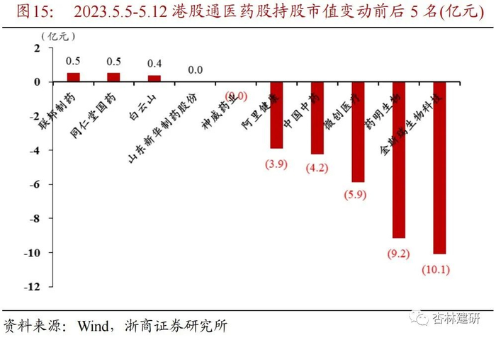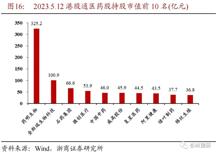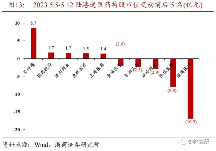 具体持仓标的上,2023年5月5日至5月12日陆港通医药标的市值增长前5名分别为片仔癀、国药股份、济川药业、鱼跃医疗、上海医药,市值变动后5名分别为迈瑞医疗、恒瑞医药、以岭药业、华润三九、金域医学。港股通医药标的市值增长前5名分别为联邦制药、同仁堂国药、白云山、山东新华制药股份、神威药业,市值变动后5名分别为金斯瑞生物科技、药明生物、微创医疗、中国中药、阿里健康。