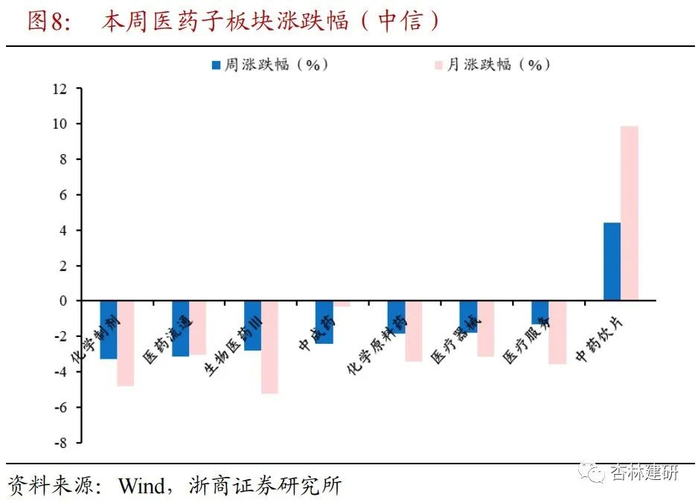 根据Wind中信医药分类看,本周医药子行业表现较为分化,除中药饮片(+4.4%)涨幅较大外,其他板块均有所下跌,其中化学制剂(-3.3%)、医药流通(-3.2%)、生物医药(-2.8%)、中成药(-2.4%)均有较大跌幅。