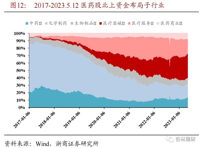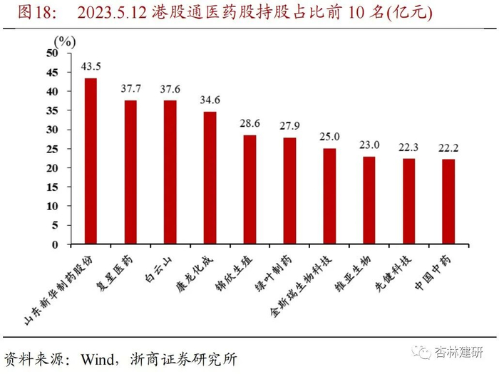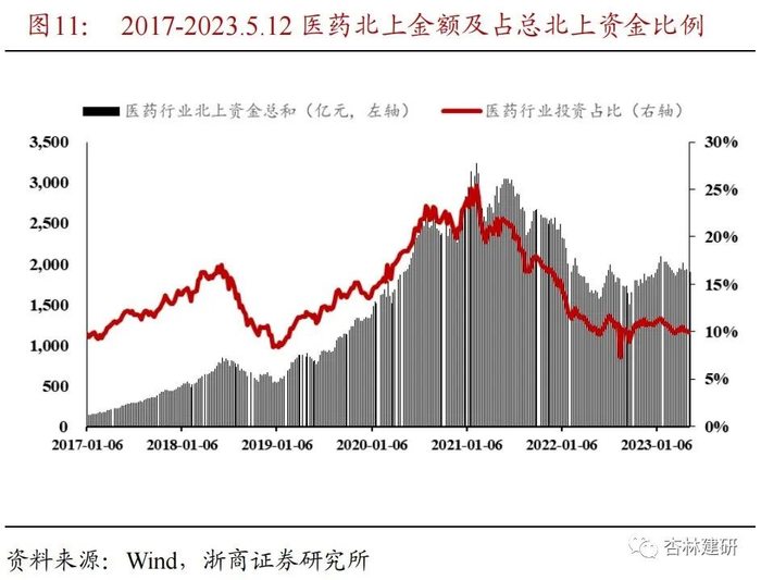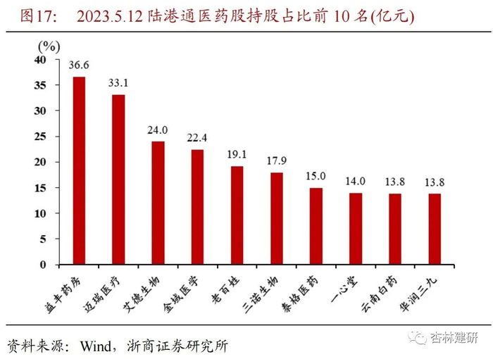 截至2023年5月12日,陆港通医药行业投资1899亿元,医药持股占陆港通总资金的9.9%,医药北上资金环比下降35亿元。细分板块中,除中药(+9亿元)环比流入外,其他板块均环比流出,其中医疗服务(-16亿)、医疗器械(-14亿)、化学制药(-14亿)环比净流出较多。