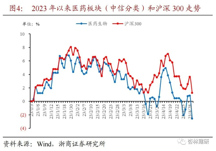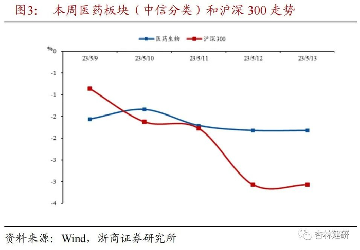 本周医药板块跌幅2.3%,跑输沪深300指数0.3个百分点,在所有行业中涨幅排名倒数第10。2023年以来中信医药指数累计跌幅1.4%,跑输沪深300指数3.1个百分点,在所有行业中排名倒数第12。