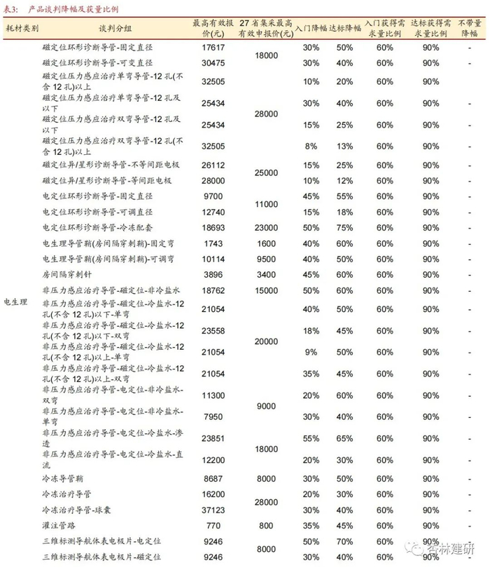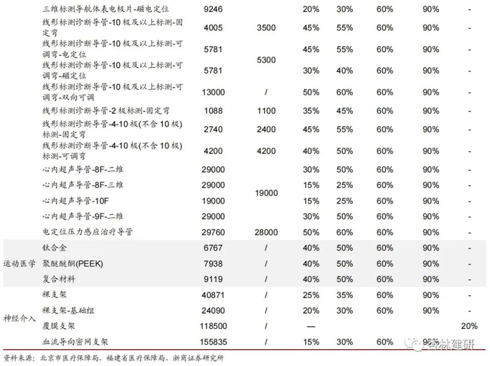 价:我们认为DRG与带量采购联动,耗材降幅或更趋合理。DRG限制费用极高病例与费用极低病例,单个病例在合理付费范围内波动,而且会逐年进行调整至合理水平,若耗材一次性降价过多,医院无法享受厂商较好服务,还会面临下一年DRG付费的调整。我们认为,在联动下,医院会更倾向于一个相对合理的价格,并留出部分创新器械的使用空间。同时,DRG既兼顾了全国统一,又保留了地方的差异,我们认为,若DRG与带量采购联动全国推行,部分耗材带量采购放至省份,厂商或会有更强的议价能力,并根据各区域产品采购的类型不同形成差异化的定价。同样,反观本次DRG与耗材联动,电生理分类更加细化、降幅也更为合理。相对创新的产品如“磁定位压力感应治疗双弯导管-12孔(不含12孔)以上”入门降幅仅8%(获得60%的需求量),达标降幅13%(获得90%的需求量);而竞品相对较多的产品,降幅在30%-70%(最高有效申报价接近福建省最高有效申报价)。整体看来,降幅相对温和。我们认为,DRG与带量采购联动,或将在耗材中标品类与价格界定上,呈现相辅相成、更加合理的趋势。