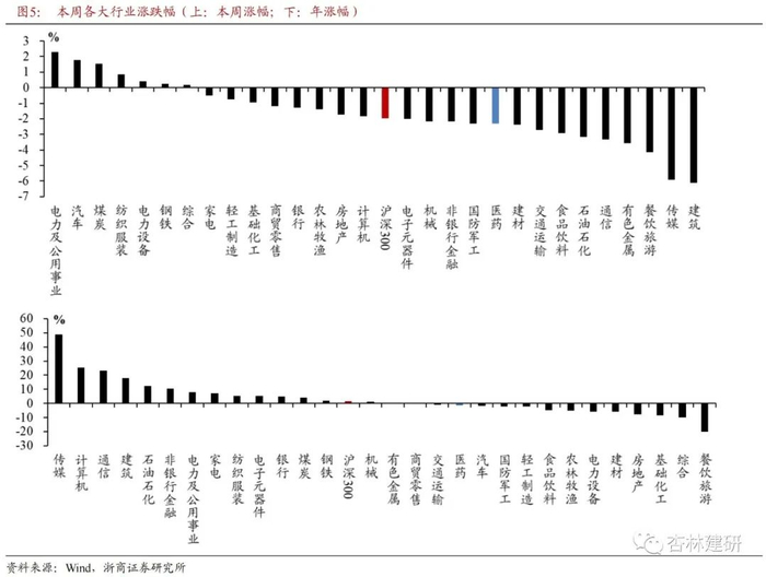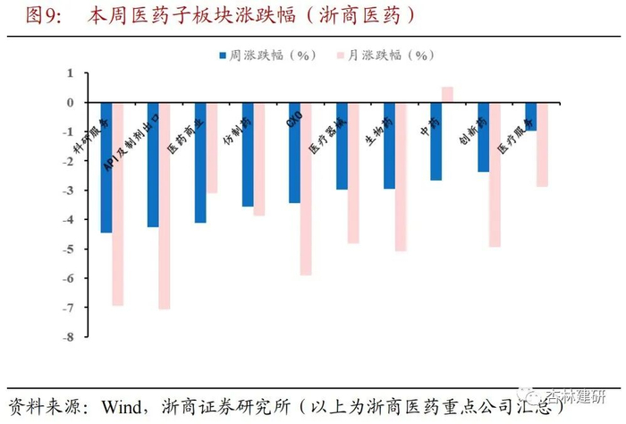 细分板块分析:根据Wind中信医药分类看,本周医药子行业表现较为分化,除中药饮片(+4.4%)涨幅较大外,其他板块均有所下跌,其中化学制剂(-3.3%)、医药流通(-3.2%)、生物医药(-2.8%)、中成药(-2.4%)均有较大跌幅。根据浙商医药重点公司分类板块来看,本周各板块均有较大回调,其中科研服务(-4.4%)、API及制剂出口(-4.3%)、医药商业(-4.1%)跌幅较大。具体看,科研服务板块泰坦科技(-14.3%)、皓元医药(-8.2%);API及制剂出口板块博瑞医药(-8.1%)、富祥药业(-6.2%);医药商业板块国药股份(-7.2%)、老百姓(-6.4%)有较大跌幅;另外医疗器械板块微创机器人(-12.4%)、贝瑞基因(-11.4%);CXO板块普蕊斯(-11.8%)等也均有较大跌幅。根据Wind中信医药分类看,本周医药子行业表现较为分化,其中医药流通(+4.3%)、中成药(+2.5%)和化学制剂(+2.2%)涨幅较为明显。医疗服务(-3.7%)和生物医药(-1.0%)下调相对较多。