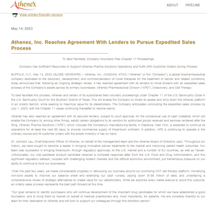 近日,纳斯达克上市公司Athenex在其官网发文宣布破产,并称经过持续的战略审查,已与贷款机构达成协议,将加快出售旗下Athenex制药部门(Athenex Pharmaceutical Division,简称APD)、Orascovery口服制剂业务、以及细胞治疗业务。