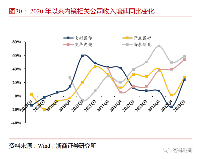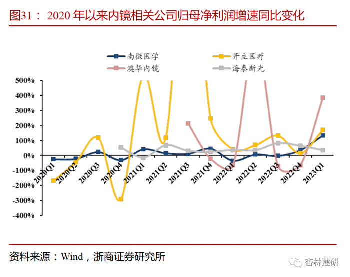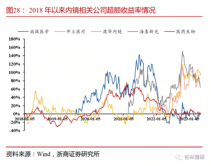 2020年以来,尽管受到新冠疫情扰动等因素影响,内镜相关领域企业包括开立医疗、澳华内镜、海泰新光等,在创新产品上市并驱动国产替代加速下,营收增速同比进入加速阶段,股价超额收益率表现较为亮眼,2022年9月末,贴息贷款政策驱动内镜板块股价进一步拉升,超额收益率均值相对医药生物最高达到71.1%,截止到2023年5月17日超额收益率仍有39.4%。而作为内镜耗材 领域龙头的南微医学,因为疫情导致门诊手术量下滑,对内镜耗材使用的影响较大,业绩及股价表现欠佳。我们认为,2020年以来国产内镜设备装机明显提速,内镜手术渗透率有望快速提升,此外,随着2023年疫情消退带来门诊手术快速恢复,内镜耗材等相关企业业绩有望迎来较快反弹。
