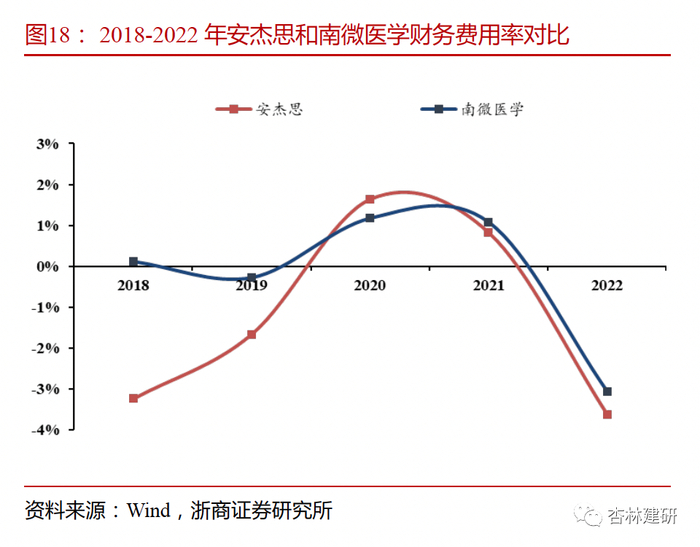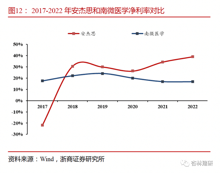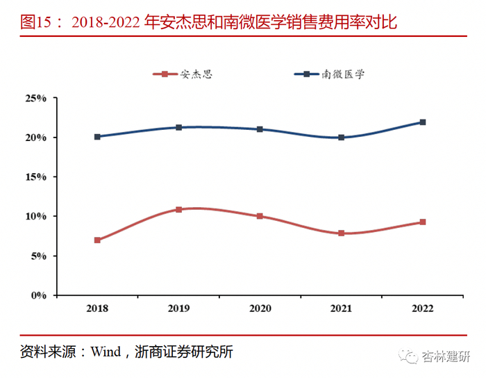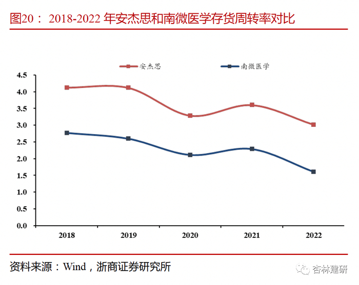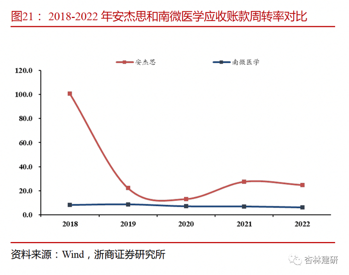 从细分产品来看,我们预计公司仍处于通过价格策略(公司多款产品平均单价低于可比公司,详见图13)进行跑马圈地的快速扩张阶段。由于公司不同细分产品相较于南微医学而言体量较小,此外,销售区域也存在一定差异(南微医学2018年国内华东区域收入占比最大,为25.6%,而华东区域虽同样为安杰思最大销售区域,2018年占比只有13.3%,到2022年提升到19.2%,另外,2022年公司海外区域收入占比48.2%,高于南微医学6.35pct),导致在疫情影响下,表现出较大的波动性和疫后的恢复弹性。