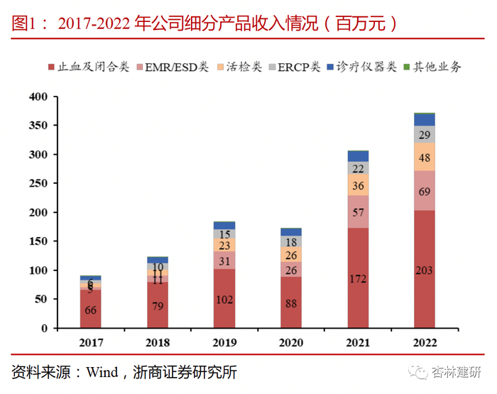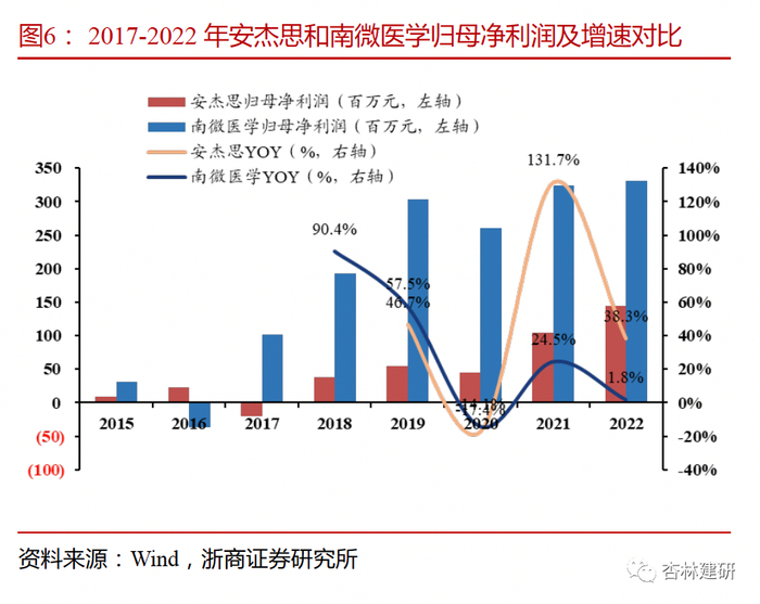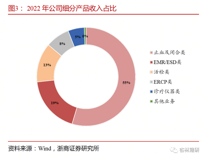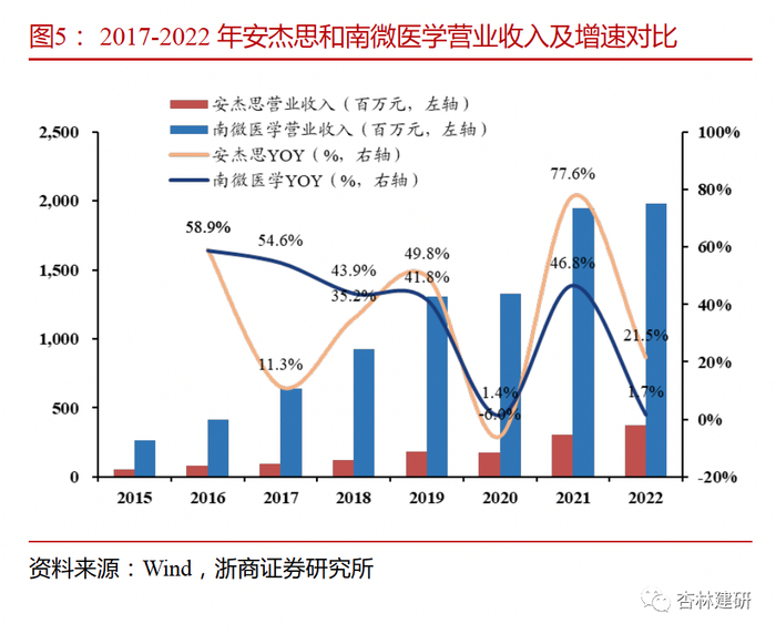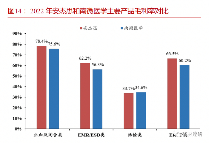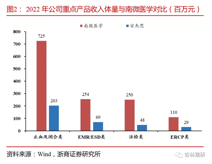 从产品结构和收入体量来看:公司主营产品与南微医学重合度较高(2022年,两公司相同业务板块,安杰思收入3.5亿,占总营收94.1%,南微医学收入13.4亿,约为安杰思的3.8倍,占总营收67.6%,),其中止血闭合类、EMR/ESD类以及活检类均为两家公司前三大业务。