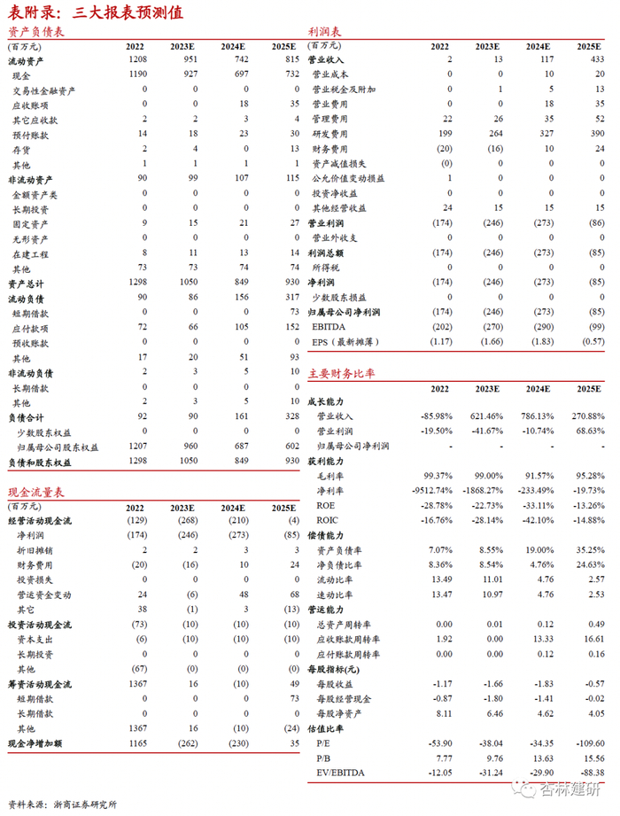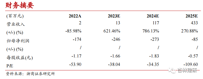 我们预计公司2023-2025年实现营业收入0.13、1.17、4.33亿元,分别同比增长621.46%、786.13%、270.88%,实现归母净利润-2.46、-2.73、-0.85亿元,对应EPS为 -1.66、-1.83、-0.57元。2023年5月18日对应PE为-38、-34、-110倍,给予“买入”评级。