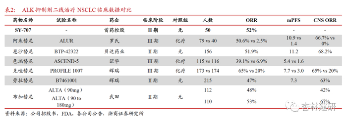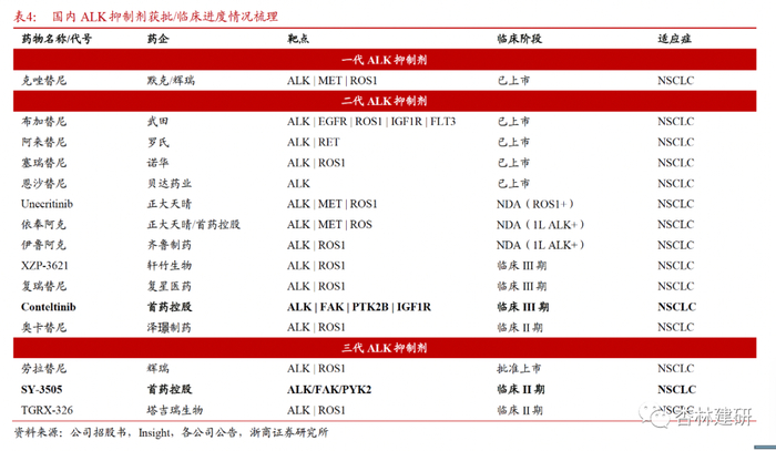 从国内处于NDA和临床II期以后管线梳理看,中国生物制药(正大天晴)、齐鲁制药的3款ALK抑制剂处于NDA状态(2款针对ALK阳性,1款ROS1阳性),我们预计首药控股SY-707也将很快进入NDA阶段,从差异化和安全性角度看有望抢占一定市场份额。