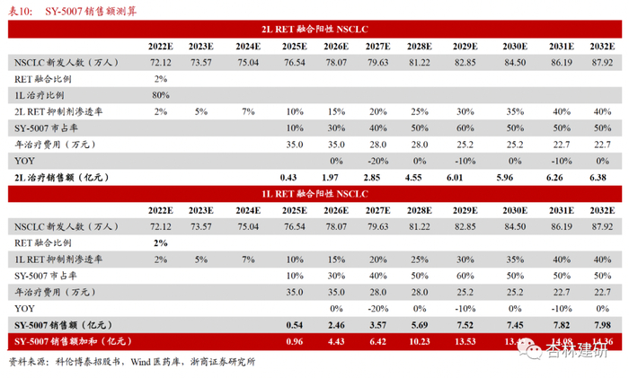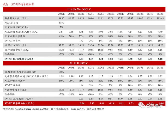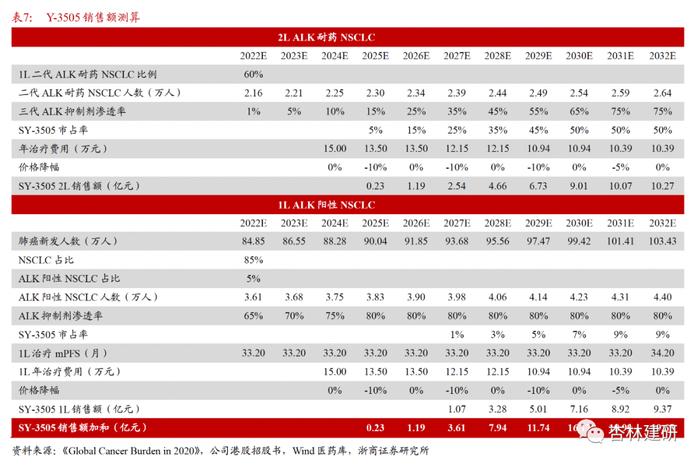 市占率:1)1L ALK阳性NSCLC:我们假设2027年上市,市占率从1%不断提升至最高9%;2)2L ALK耐药NSCLC:我们假设2025年上市,考虑到国内竞争格局较佳,仅有一款进口药劳拉替尼获批,我们假设SY-3505市占率从5%不断提升至最高50%;