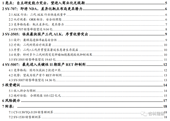 1)我们认为本土ALK抑制剂市场仍有较大的成长空间,竞争格局有望逐步向国产占优演变。2)从临床数据看:ORR相当,安全性理想。II期临床数据显示:SY-707针对克唑替尼耐药的ALK阳性晚期非小细胞肺癌患者的ORR达52.00%,对比已上市药物具有可比的疗效(仅为非头对头ORR绝对值对比)。3)从竞争格局角度看:差异化靶点布局,更大潜力。SY-707对于对几个重要的克唑替尼耐药突变体( L1196M、 F1174L等)表现出良好的抑制活性,对于 FAK、PYK2、IGF1R等其他激酶也具有良好的抑制效果。从差异化和安全性角度看有望抢占一定市场份额。4)根据我们测算SY-707销售峰值望达9.04亿。