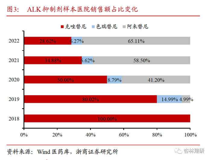 ALK抑制剂竞争格局有望逐步向国产占优演变。1)克唑替尼最先上市,2020年前主导市场。克唑替尼2013年在中国最早上市销售。根据Wind样本医院市场数据,上市以来克唑替尼保持了平稳较快增长,2018年纳入医保后量价对冲销售额略有下滑,2019年销售额快速提升,2019-2022年年销售稳定在3.56-4.83亿(样本医院数据非最终销售额)。2)阿来替尼后来居上,强势登顶。阿来替尼和色瑞替尼均于2018年国内获批上市,但是阿来替尼凭借更优临床数据以及更强获益数据销售额快速攀升,并在2021年实现样本医院7.32亿销售额,居于ALK抑制剂销售榜首。3)未来推演:国产占优可期。我们认为伴随着更多的本土创新药获批上市,本土ALK抑制剂市场有可能会逐渐变为本土ALK抑制剂主导(定价优势、本土推广优势)。因此我们看好国产ALK抑制剂未来成长性(参考埃克替尼、康柏西普等市占率提升趋势演变)。