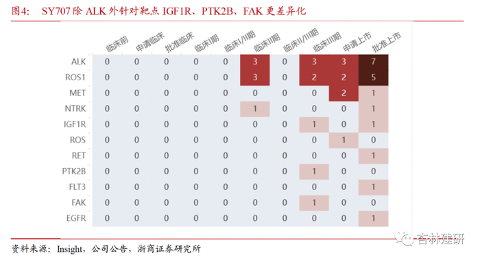 从竞争格局角度看:差异化靶点布局,更大潜力。SY-707对于对几个重要的克唑替尼耐药突变体( L1196M、 F1174L等)表现出良好的抑制活性,SY-707作用的激酶谱与其他 ALK抑制剂存在差异, SY-707对于 FAK、PYK2、IGF1R等其他激酶也具有良好的抑制效果。