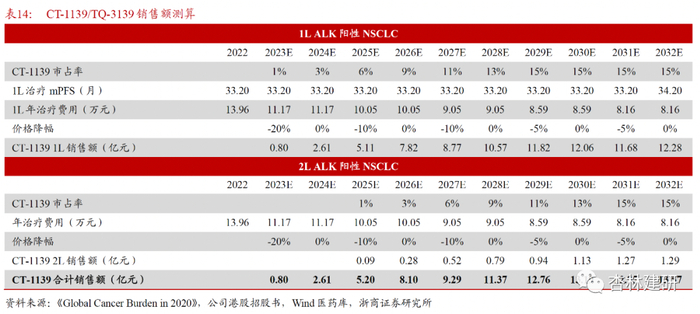 市占率:我们假设1L ALK阳性NSCLC和 2L ALK阳性NSCLC 适应症分别在2023年和2025年获批上市,市占率最开始为1%,考虑到中国生物制药比较强的销售能力,我们假设市占率逐步提升至最高15%;