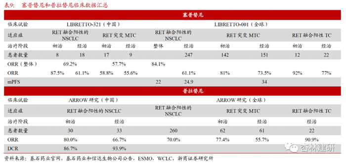获批RET抑制剂中国患者数据优异。从普拉替尼和塞普替尼披露的临床数据来看,在NSCLC、MTC和TC治疗中均展现出较好的ORR和mPFS数据。ARROW研究数据显示,普拉替尼在初治和经含铂化疗的RET融合阳性的NSCLC中国患者中显示出了优越和持久的抗肿瘤活性,ORR分别为80.0%和66.7%。无论既往是否接受过治疗,普拉替尼在中国RET融合阳性NSCLC患者中均显示出较高的ORR。既往接受过铂类化疗的患者(N=33)ORR为66.7%,DCR为93.9%。未接受过系统性治疗的患者(N=30)ORR为 80%,DCR为 86.7%。塞普替尼中国临床中26例被纳入PAS。在 PAS 中, IRC评估的ORR为69.2%,初治患者ORR为87.5%,后线治疗患者的ORR为61.1%。RET抑制剂中国患者治疗数据与全球基本保持一致。