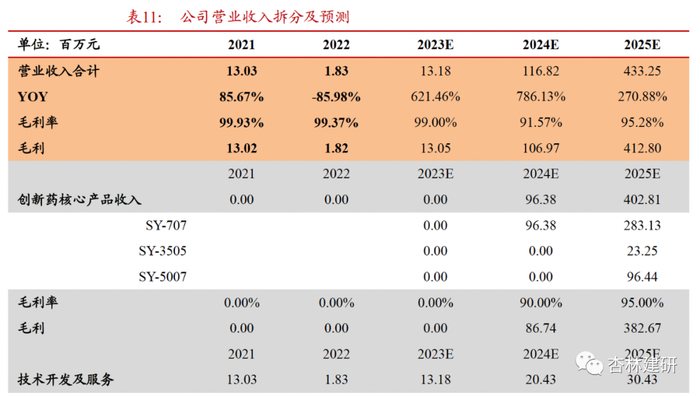 核心产品销售额:参考前文对核心产品SY-707、SY-3505和SY-5007等销售额预测,我们预计2023-2025年核心产品销售额加和为0/96.38/402.81百万元。