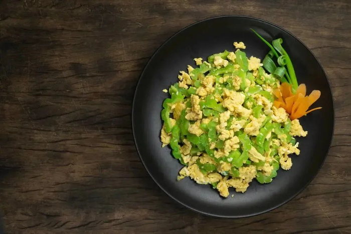 3.炒锅入油,烧热后倒入苦瓜鸡蛋液,翻炒至熟即可。