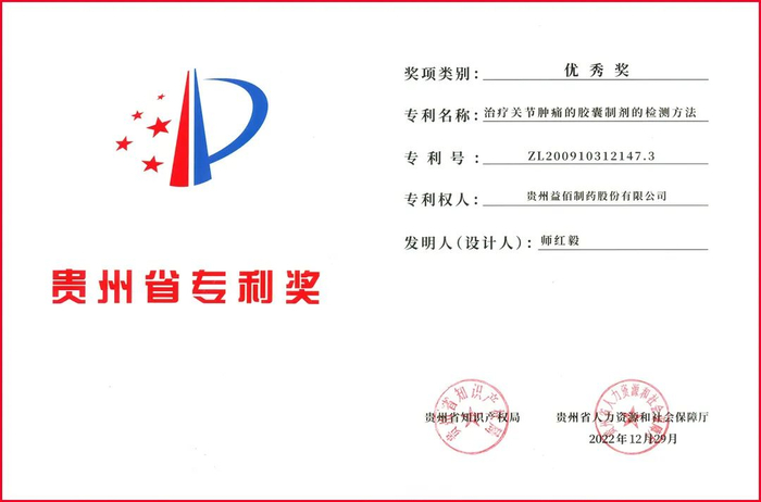 近日,贵州益佰制药股份有限公司金骨莲胶囊专利(“治疗关节肿痛的胶囊制剂的检测方法”,专利号:ZL200910312147.3)获评2021-2022年度贵州省优秀专利奖,并获得3万元资助款。该专利是针对金骨莲胶囊中特定成份制定的检测方法,是首次用于控制金骨莲胶囊产品质量,该检测方法被纳入了金骨莲胶囊国家药品标准(标准号:WS-10093(ZD-0093)-2002-2012Z)。