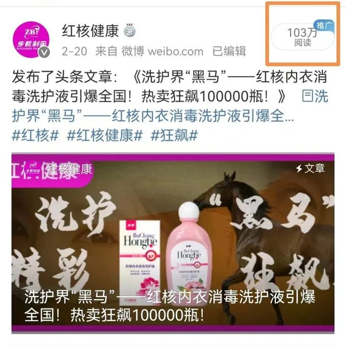 步长制药电商新媒体团队凭借网感和追热点的“高杠杆营销打法”,从toC用户端和内容端贴合“狂飙”热度,巧定位——狂飙100000瓶的洗护界“黑马”红核内衣消毒洗护液单品引爆,通过策划系列视频、图文、海报等形式,在线上全媒体平台进行宣传造势,微博端更是曝光超百万!
