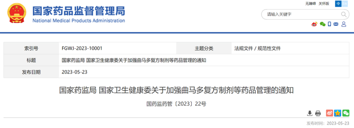 5月23日,国家药监局消息,国家药监局国家卫生健康委联合发文加强曲马多复方制剂等药品管理。
