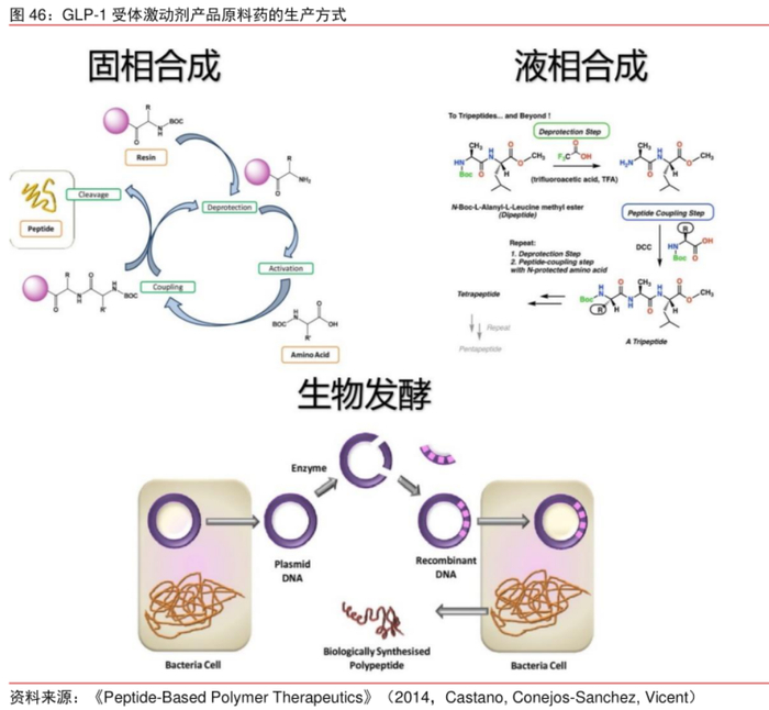 诸如司美格鲁肽等品种均为长链(超过30个氨基酸),需要用到化学法中的固相合成法制备,这类方法的缺点在于必须每个片段过量投料,成本高,纯度相对较低,不易规模化生产;优点则在于对杂质的控制是优于发酵技术。