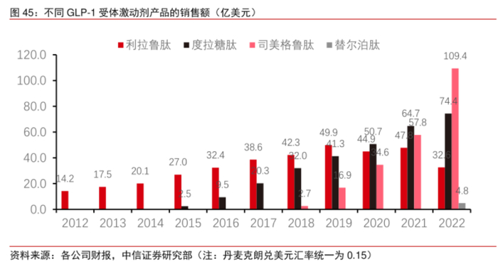 2022年,诺和诺德司美格鲁肽大卖109亿美元,礼来度拉糖肽销售额74.39亿美元,分别位列全球畅销药的第13位和第16位。