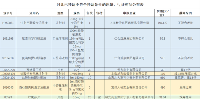 从河北公布的此批名单来看,报价过高或涨价幅度过大是撤网、不符合挂网要求的最主要原因,这也是河北近三个月来第四次针对高价挂网药品进行清理——前两次主要针对不符合1.8倍机制的化药,第三次主要清理不符合3倍价差机制的中成药和生物制剂。