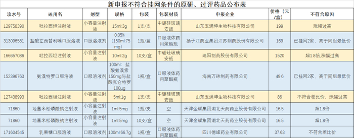 另有26个药品因报价超原研、超1.8倍或已挂网2家且高于同组最低价等因素不符合挂网要求,包括萘普生钠片、地塞米松磷酸钠注射液、注射用阿昔洛韦等。