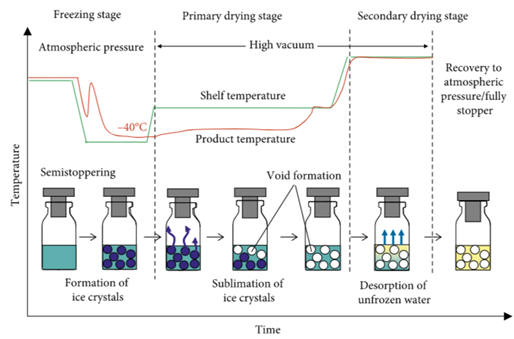 冻干过程包括三个阶段:(1)冷冻阶段,(2)初级干燥阶段和(3)二次干燥阶段,如图所示