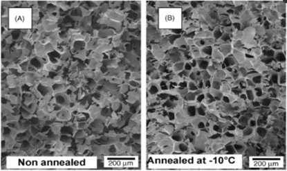 以上的设计空间是基于初级干燥阶段,但进入初级干燥阶段进行时间与冻干阶段直接相关。较高的冻结温度(较低的过冷度)导致形成较大尺寸的冰晶,冰晶的尺寸越大,实现的初级干燥效率就越高。另一方面,冰晶的大小决定了比表面积。比表面积的大小决定了二次干燥阶段的扩散和解吸速率。高冻结温度导致形成大尺寸的冰,从而减少比表面积。这导致二次干燥效率降低,增加了成品中的水分残留。因此,冷冻阶段控制冷冻温度有助于设计稳健的干燥工艺。退火是将产品在高于最终冷冻温度的温度条件下保持一段时间以使组分结晶,有助于提高结晶度。退火导致冰晶生长(如下图),导致传质阻力系数Rp减少,缩短产品一次干燥时间。