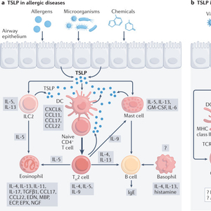 TSLP主要由上皮细胞、气道平滑肌细胞、角质形成细胞、基质细胞、成纤维细胞、肥大细胞、巨噬细胞/单核细胞、粒细胞和树突状细胞(DC)分泌。研究发现,TSLP能够分化2型细胞中幼稚的CD4+T淋巴细胞,产生IL-4、IL-5、IL-13,并降低与1型细胞相关的γ干扰素(IFN-γ)的表达,对多种细胞产生影响。