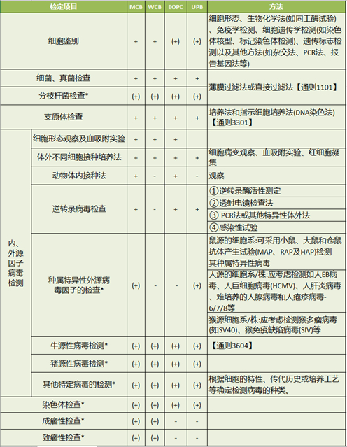 “+”为必检项目,“-”为非强制检定项目。(+)表示要根据细胞特性、传代历史、培养过程等情况要求的检定项目。