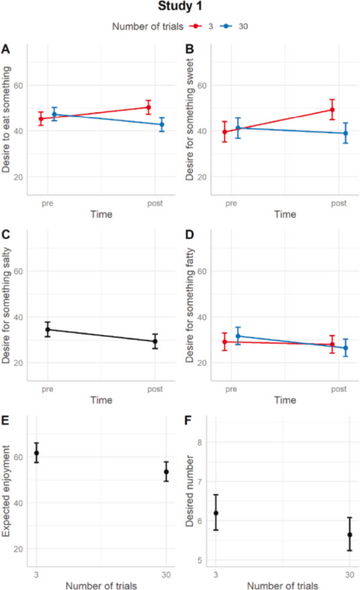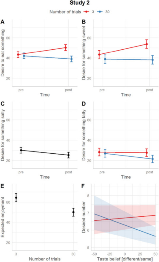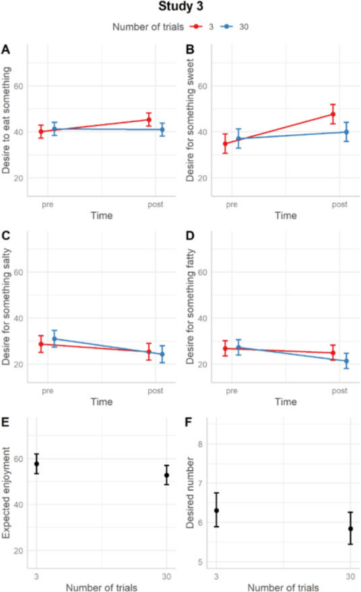 总体而言,这三项研究给出了非常相似的结果,即3次的“想象进食”确实会增加对刺激的进食欲望(此处为甜食刺激),而30次的“想象进食”则会降低这种欲望;此外,在30次“想象进食”后,与刺激无关的进食欲望也会随之减少。